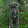 Пока еще маленький щенок немецкого дога. Серо-стальной окрас и темные глаза соответствуют стандарту породы. Некупированные ушки висят серыми "тряпочками". |
